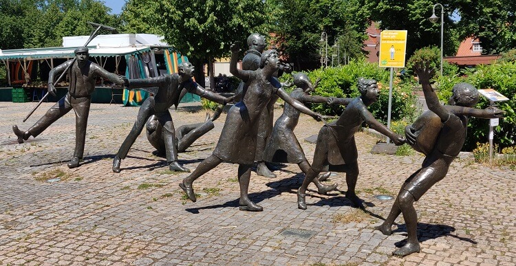 Bronze-Skulpturen "Die goldene Gans" am Schlossplatz in der Altstadt von Winsen.